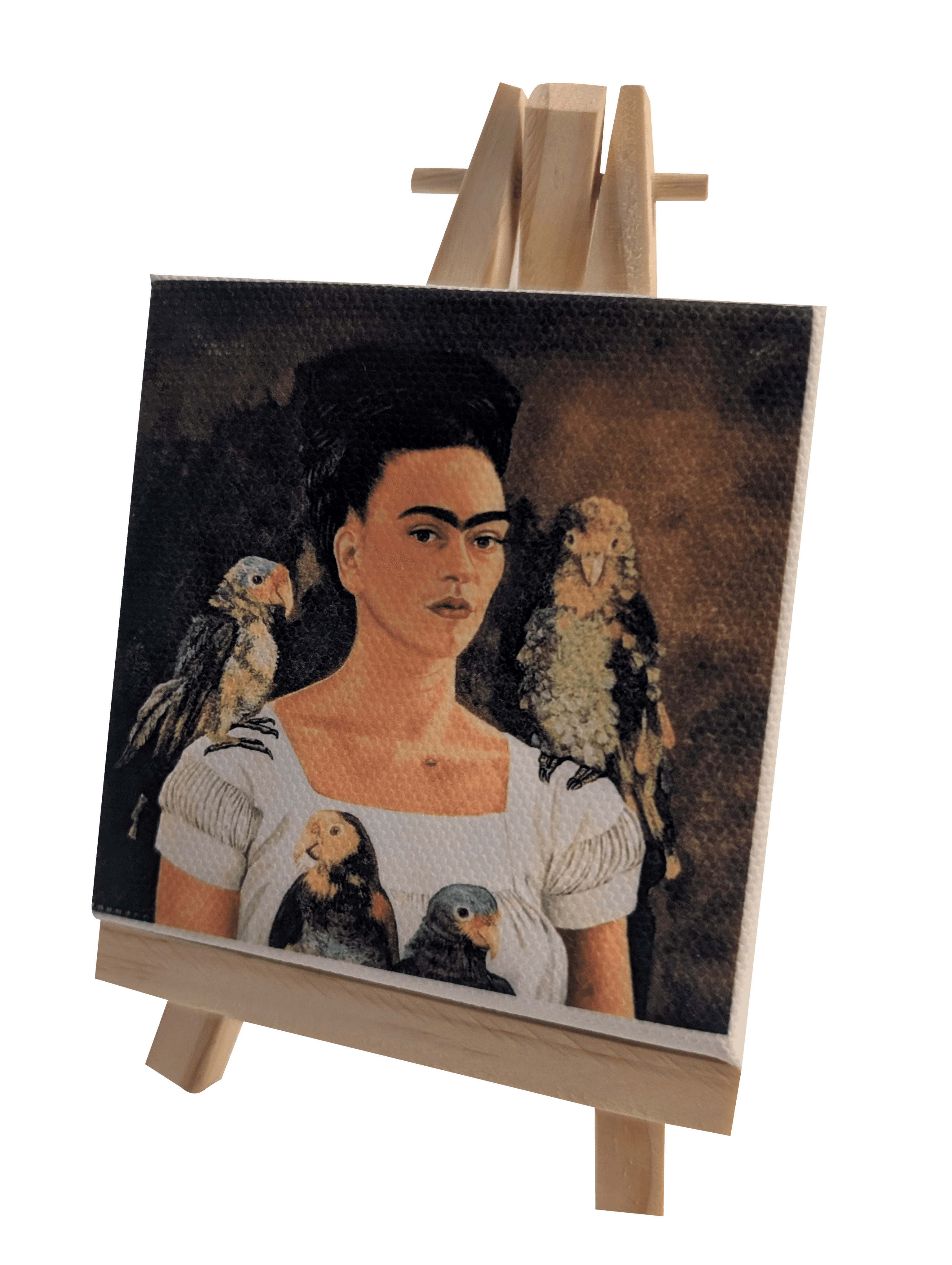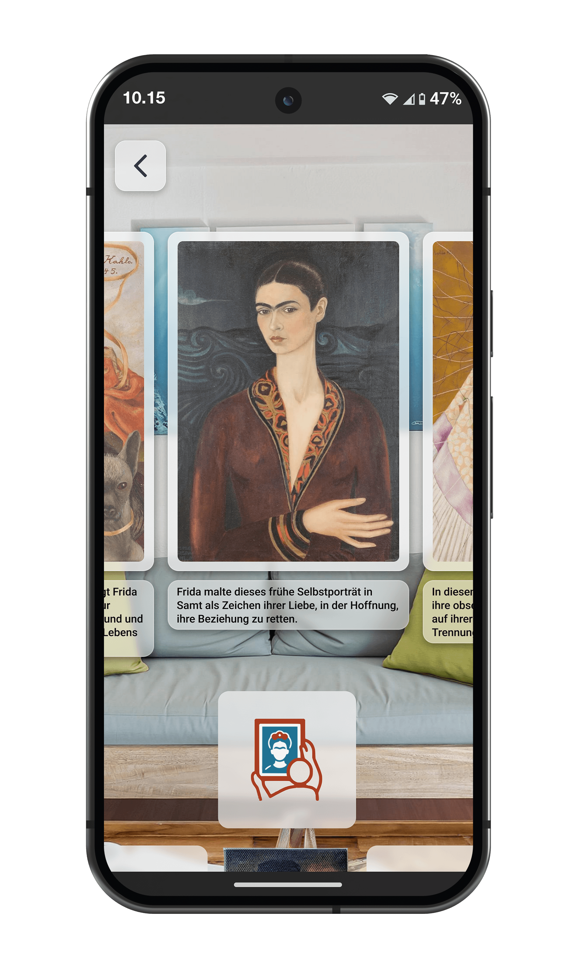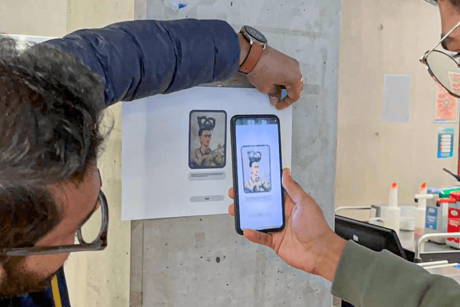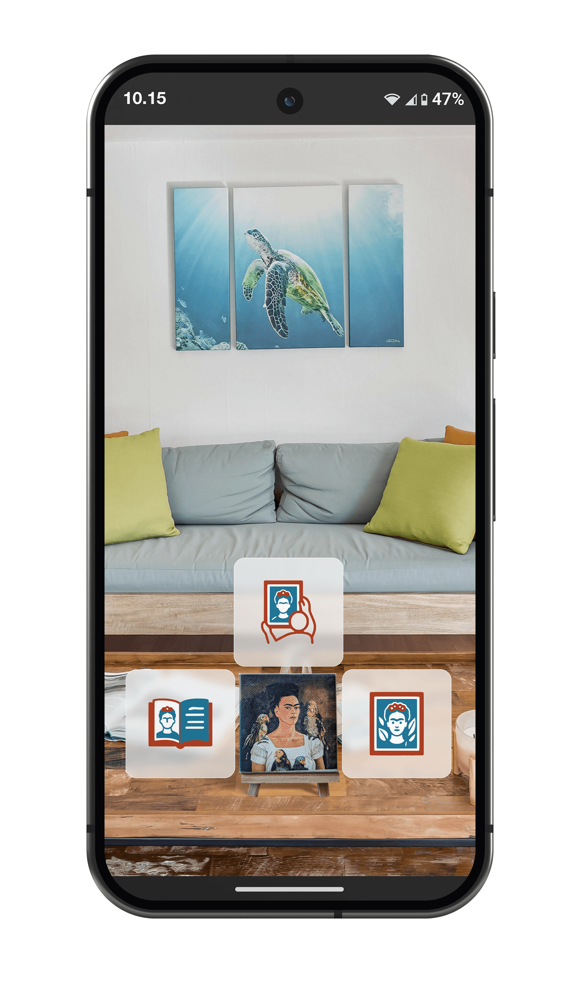 The analogue object in our AR experience is a 7.5 cm x 7.5 cm painting canvas, featuring Frida Kahlo’s self-portrait. This physical canvas serves as a tangible bridge between the real and digital worlds, allowing users to scan it with their smartphone. Once scanned, an interactive AR experience unfolds, bringing Frida Kahlo’s art and story to life in 3D. The canvas enhances immersion, making the AR interaction feel personal and engaging while preserving the essence of traditional art in a modern, mixed-reality format. This seamless blend of physical and digital realms creates a unique storytelling experience for users.