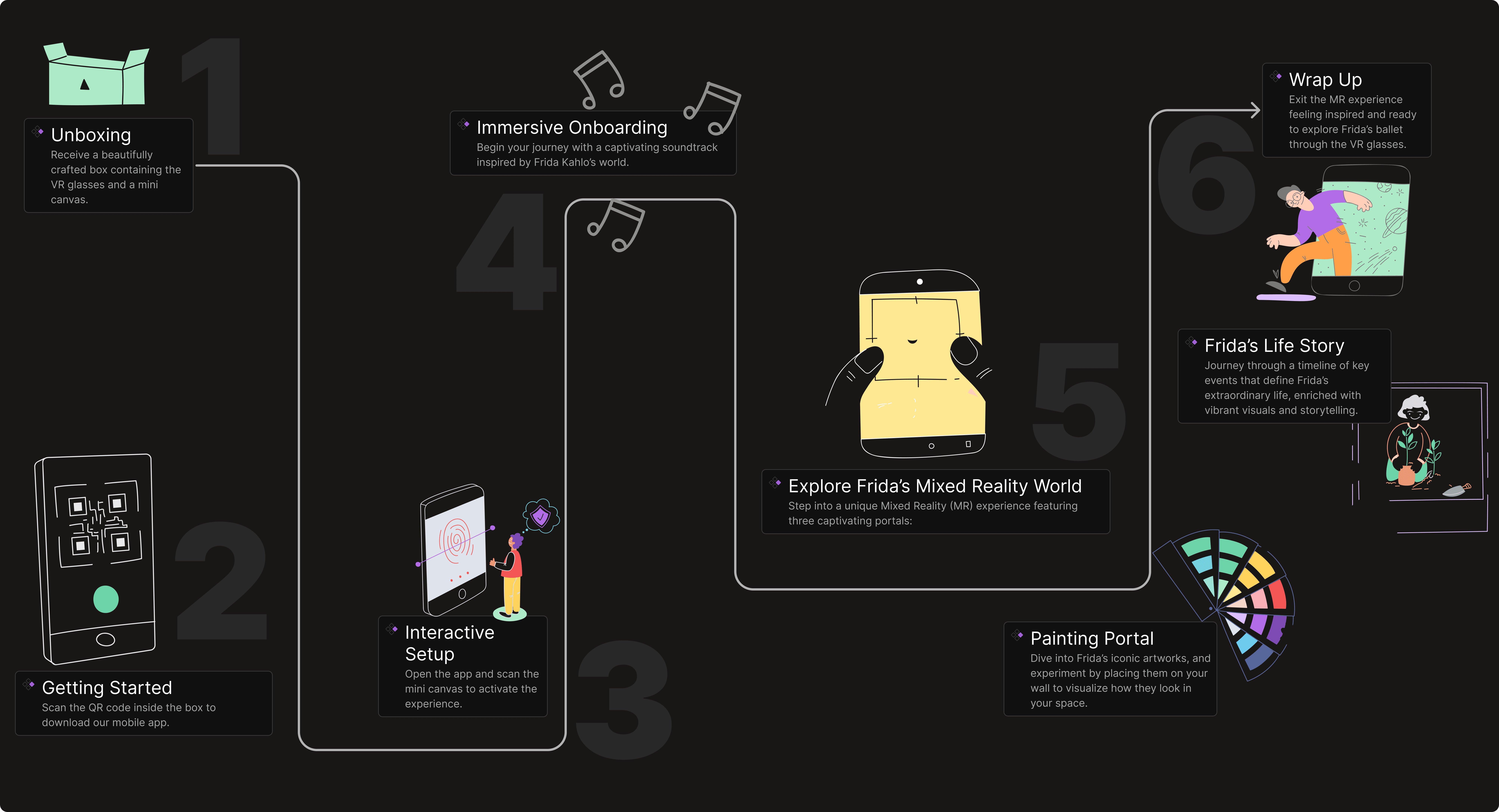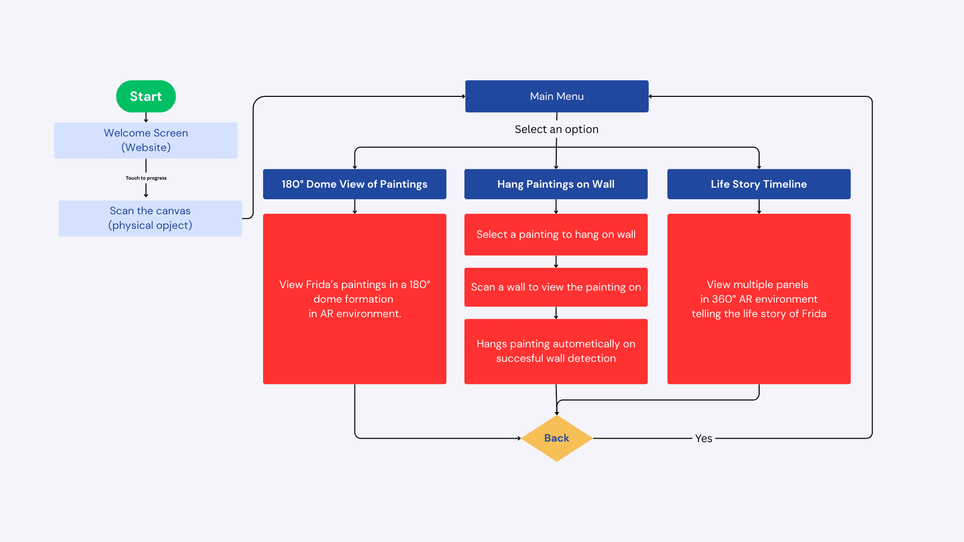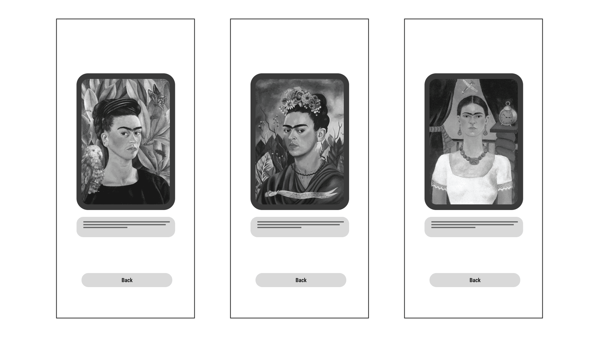 Our final prototype was developed using ProtoPie, incorporating insights from our first user test with the paper prototype. Based on user feedback, we refined the design to create a more intuitive and user-friendly experience. The improved prototype focused on seamless navigation, clear interaction cues, and enhanced AR engagement. We addressed key challenges, such as navigation clarity, intuitive painting placement, and better UI instructions, ensuring users could interact with Frida Kahlo’s art and life effortlessly. This high-fidelity prototype provided a realistic preview of the final app, allowing us to test and validate interactions before development.