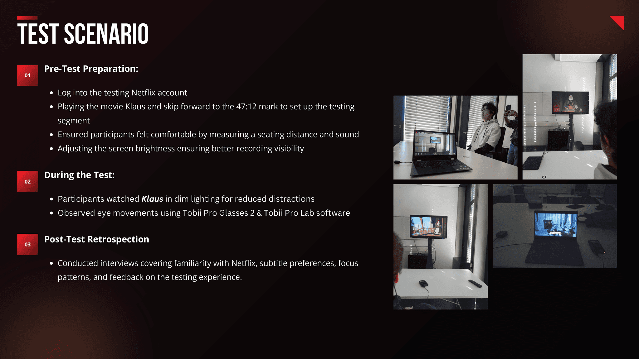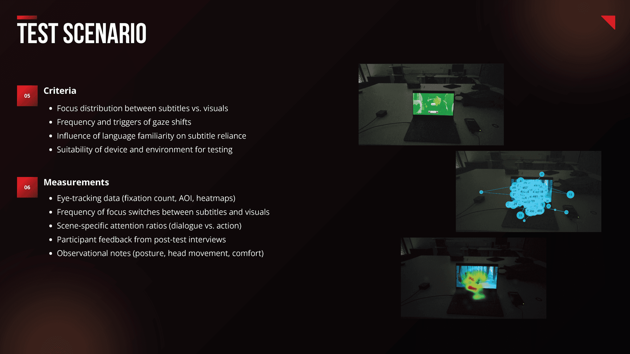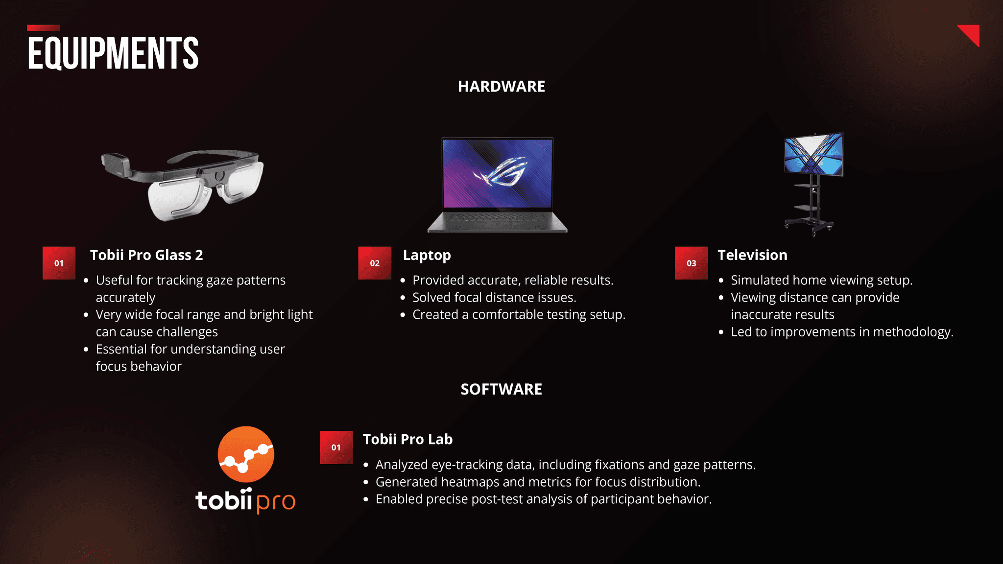 ✔ Managing all aspects related to the Tobii Pro eye-tracking glasses, including setup for optimal test conditions.