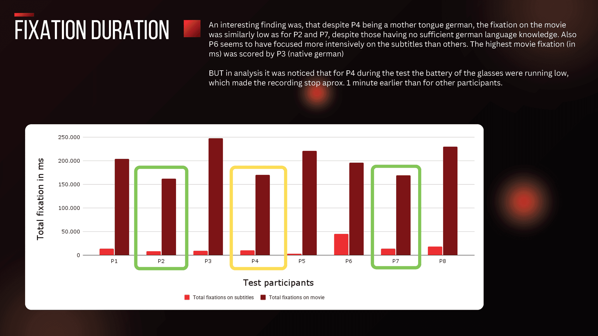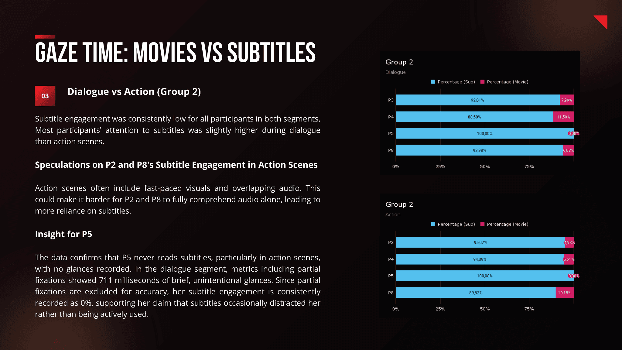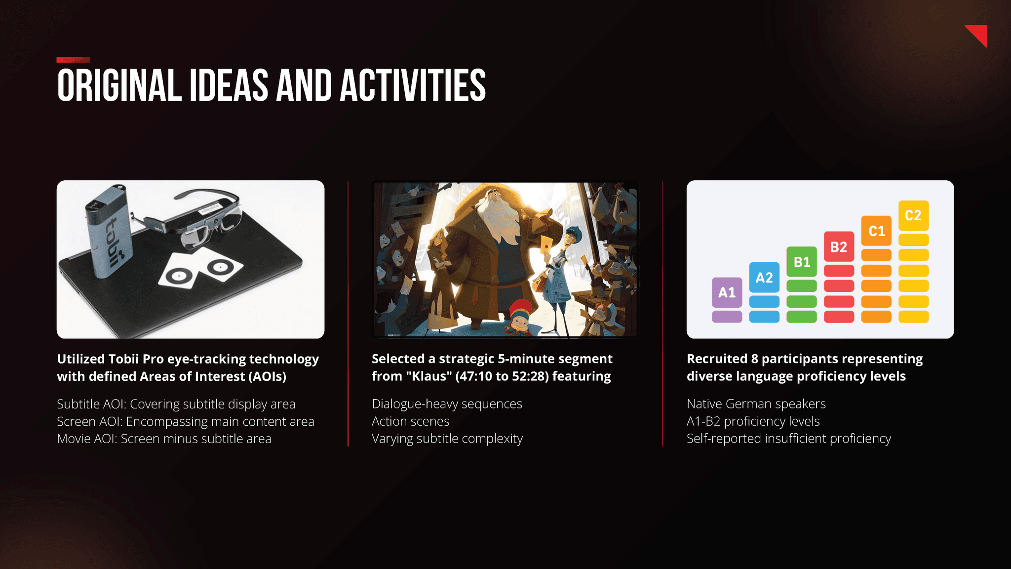 The research revealed that lower German language proficiency users relied heavily on subtitles, while higher-proficiency users used them for occasional clarification or due to reflex. Subtitles proved more engaging during dialogues than action scenes and served as a secondary clarification tool rather than a primary source of information.