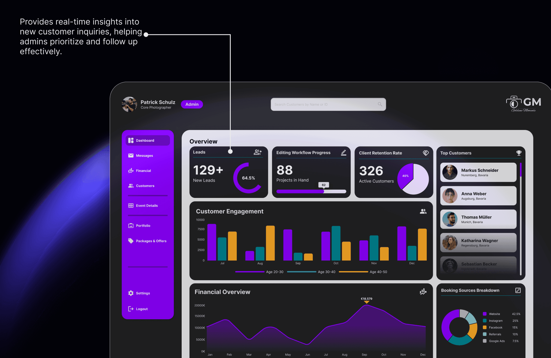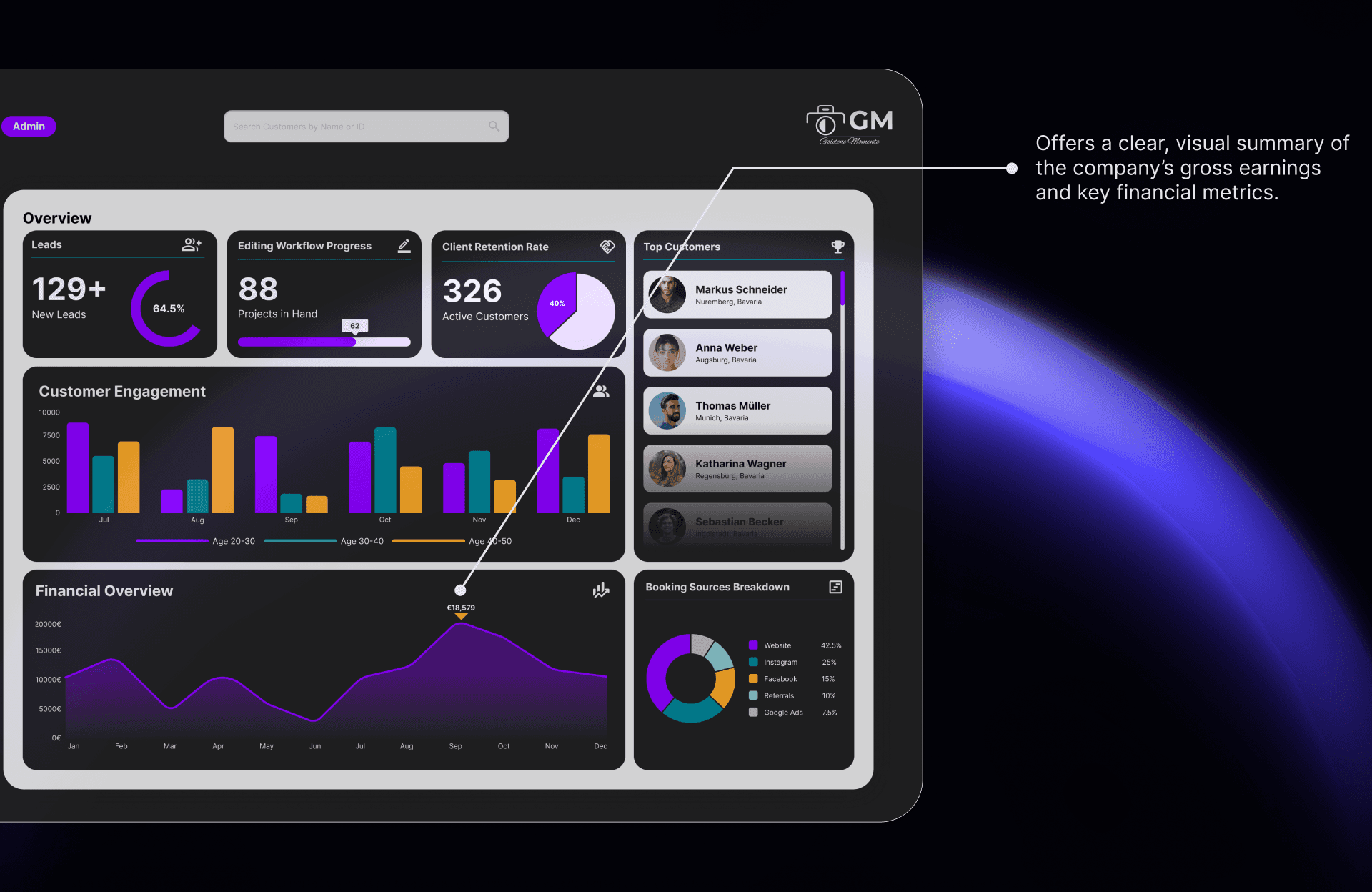✔ Interactive Dashboard: Features for lead tracking, editing workflows, financial insights, and client retention.