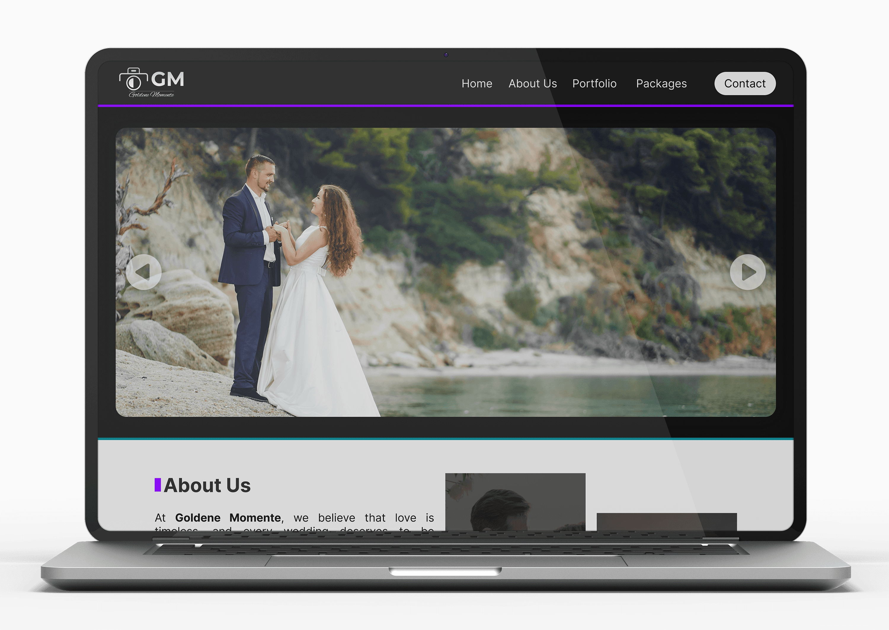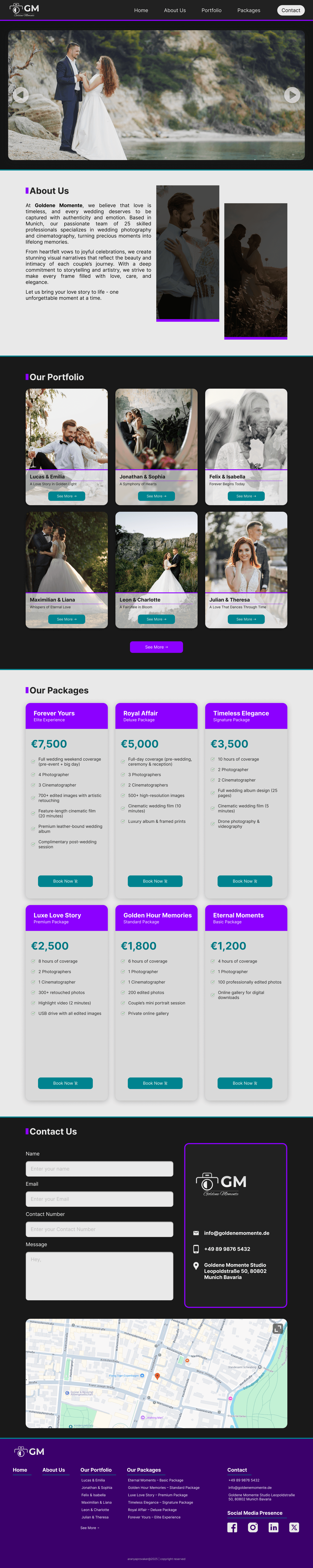 The primary website prototype for "Goldene Momente" is designed to deliver a seamless and engaging experience for wedding photography clients. It includes key sections such as the homepage, featuring elegant storytelling, a dynamic portfolio gallery showcasing past projects, a detailed packages section for comparing services and a clear contact page for inquiries.