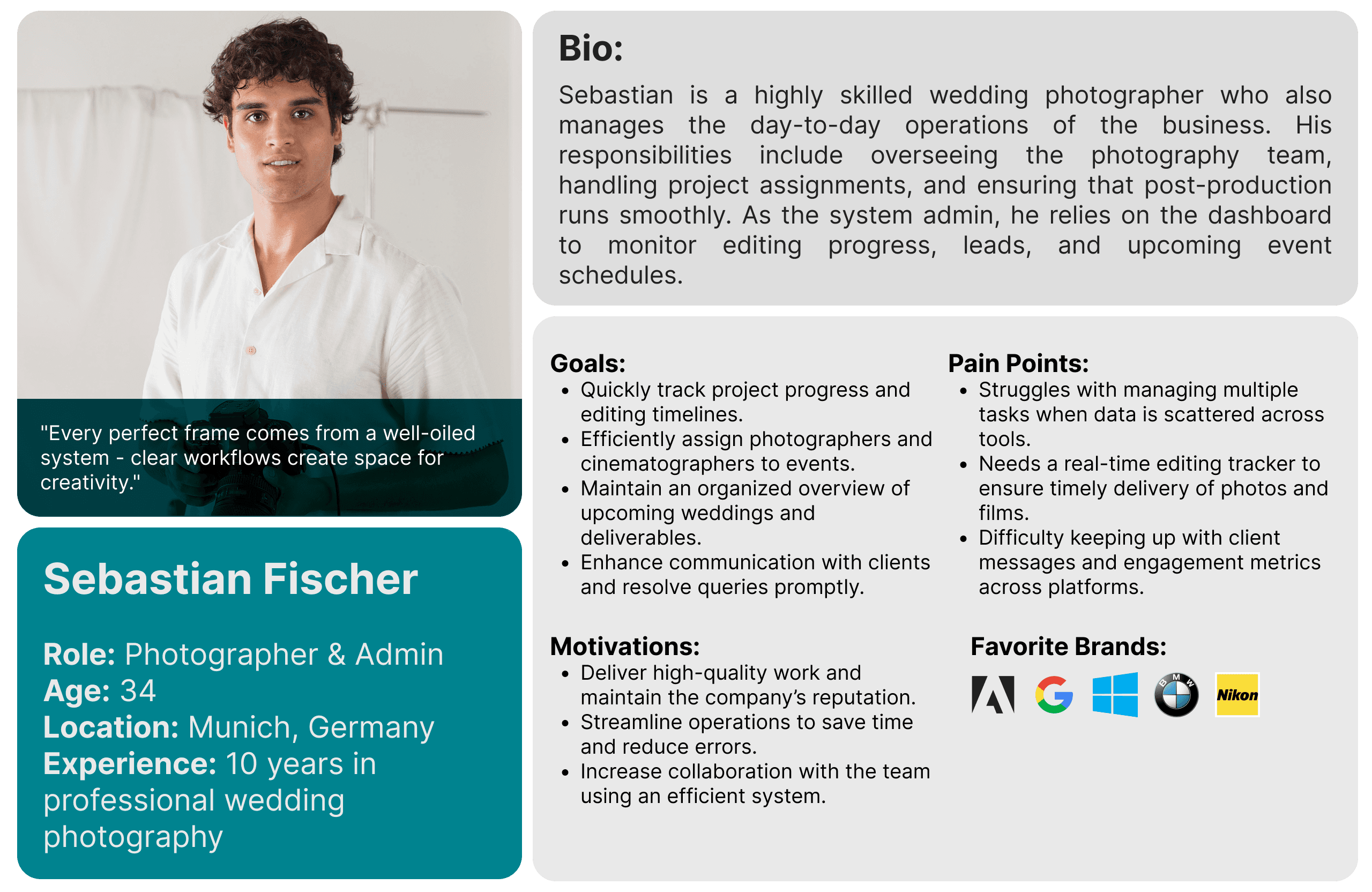 Clients searching for wedding photography services, and the company’s admin team managing operations.